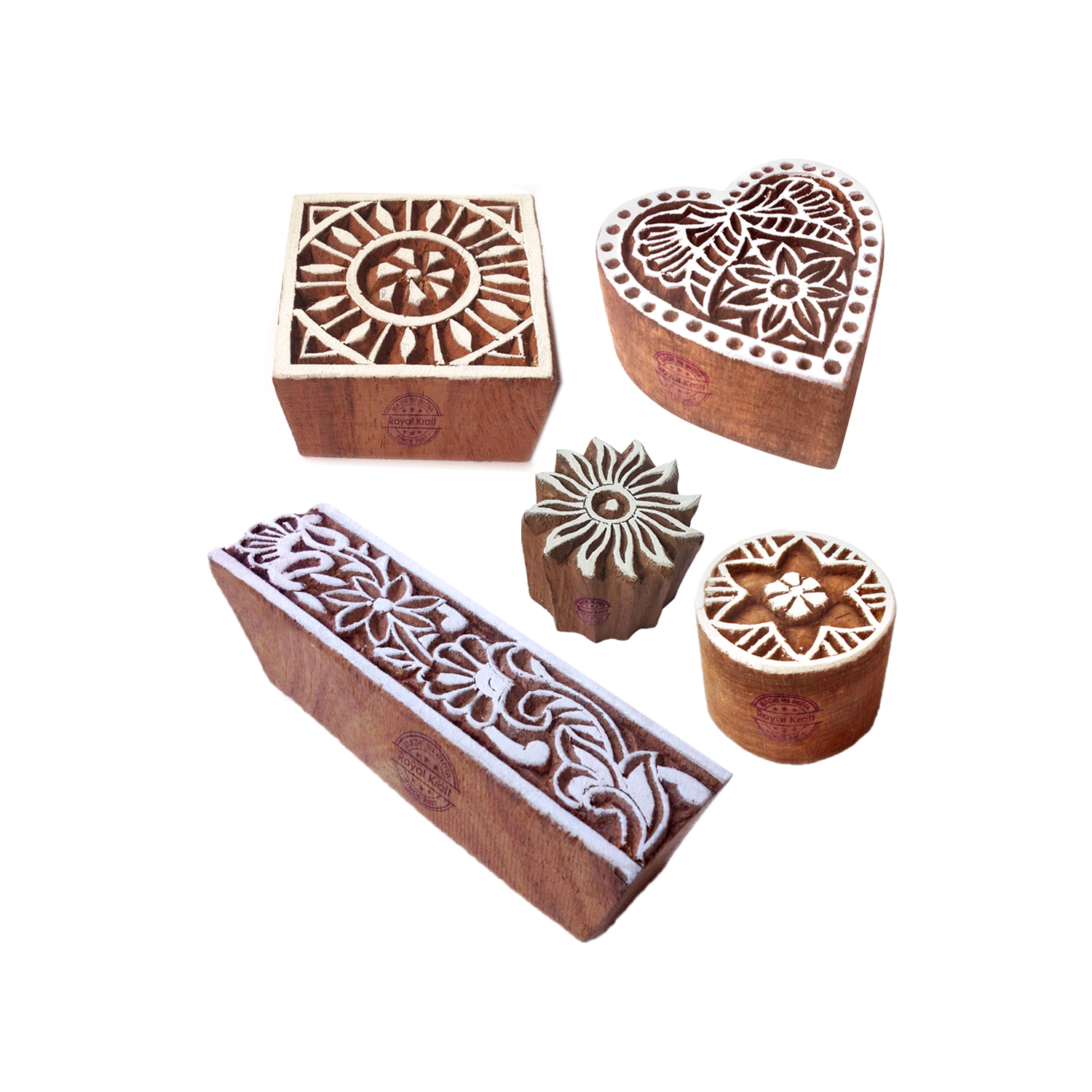 Handcarved Motif Heart and Mix Block Print Wood Stamps (Set of 5)