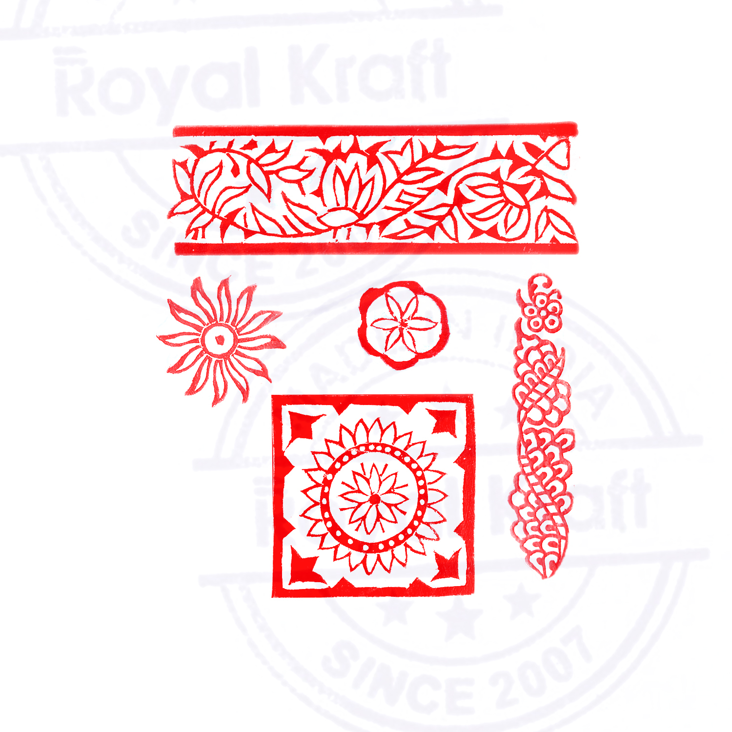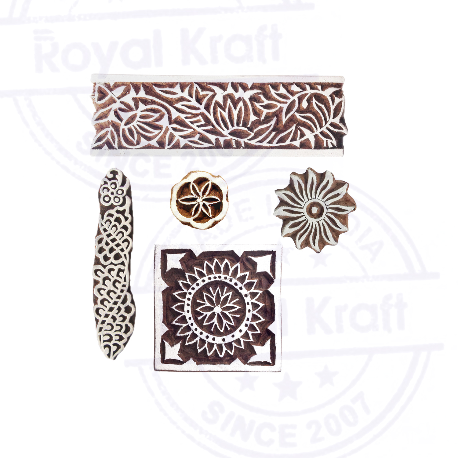 Buy Wooden Stamps for Block Printing on fabric, textile, clay, pottery, henna tattoo, paper from Royal Kraft. Wooden printing stamps are wonderful tools for adding intricate designs to various surfaces. When selecting wooden printing stamps, consider the intricacy of your design needs, the quality of the wood, and the size of the stamp. Hand-carved stamps might offer an authentic, artisanal touch, consistency in the print.
